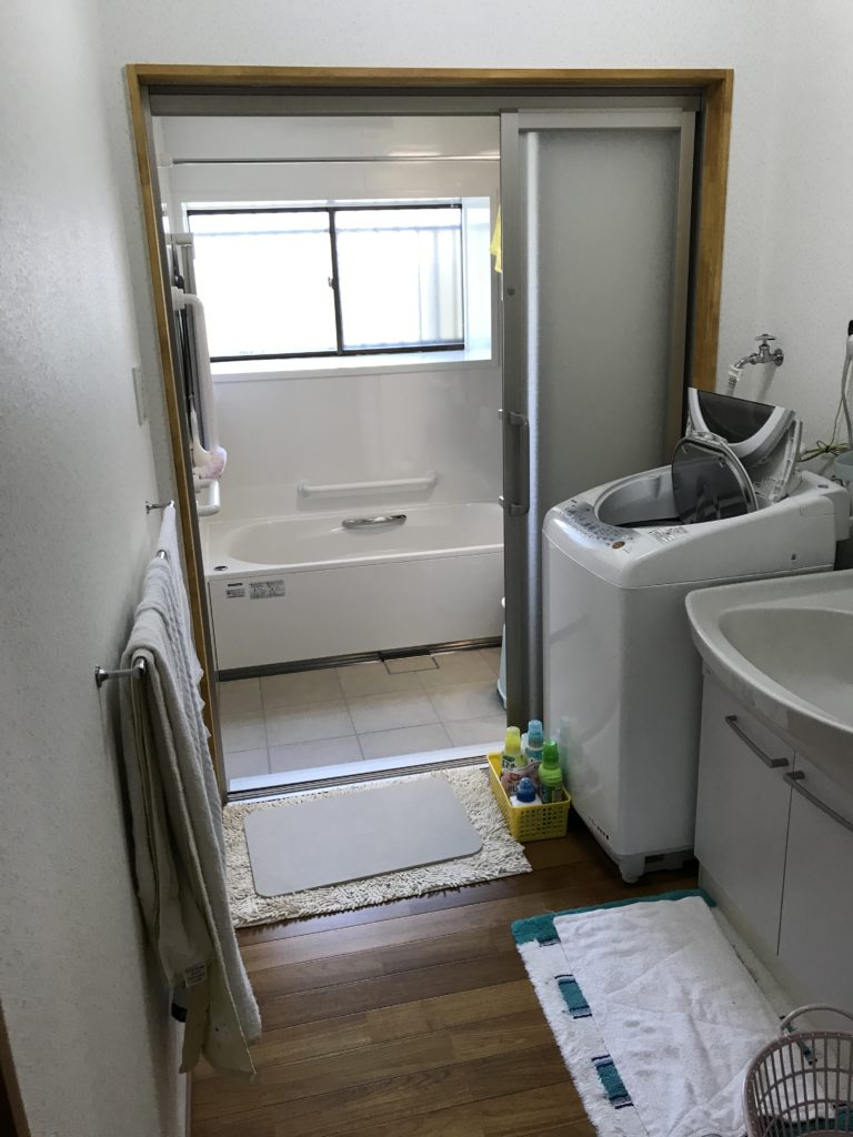 こちらのお宅も通常規格で行くと幅30cm 程もったいないゾーンができてしまうのですが、タカラスタンダードのぴったりサイズシステムバスを使うことにより写真の通りスペースにぴったり納まっております。