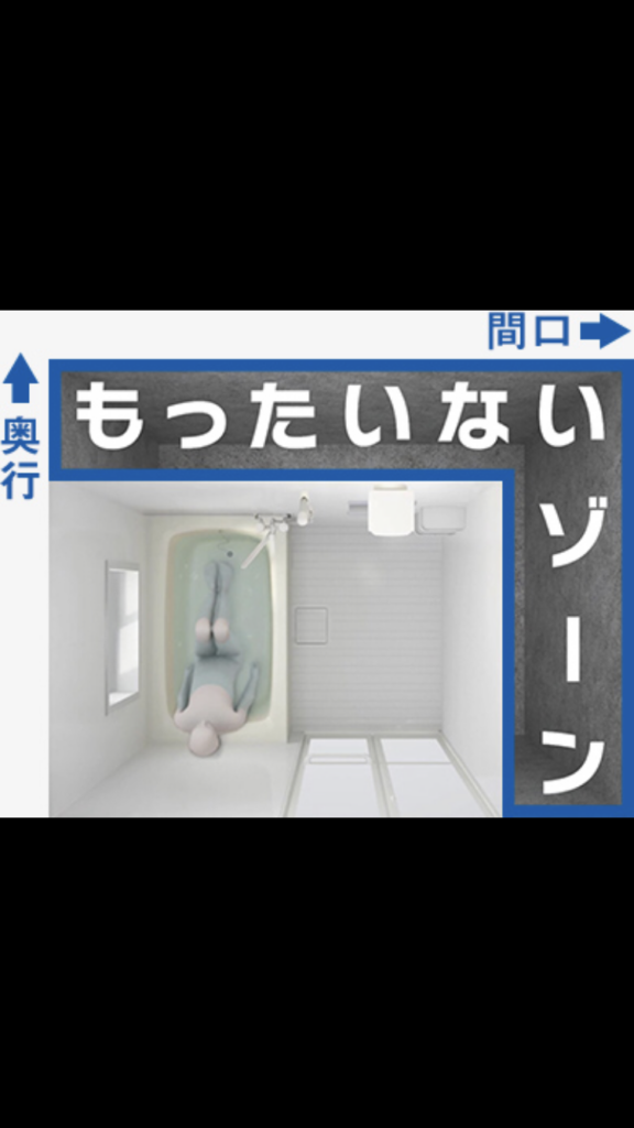 リフォームでシステムバスを設置する場合、今ある浴室の中に規格品寸法のシステムバスを入れ込むので通常の規格品だと上の写真のようなもったいないゾーンというのができてしまいます。