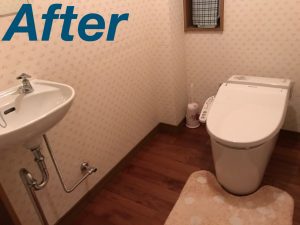 それからトイレと手洗器も床を張り替える際に取り外す必要がありましたので、古くなっていましたし、もうこの際に替えてしまったしまった方が取替費がお得ということで、交換することになりました。